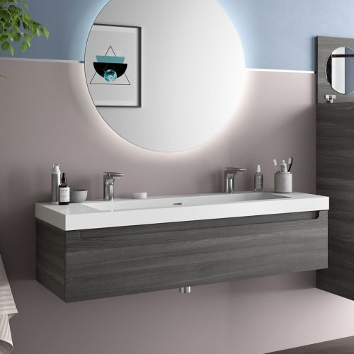 Un meuble de salle de bain au style moderne et épuré avec tiroirs de rangement.