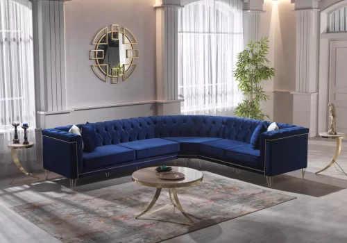 Le salon d’angle capitonné de velours bleu qui associe élégance et confort.