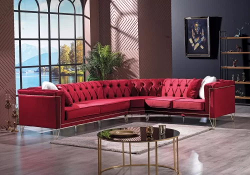 Le salon d’angle capitonné de velours rouge qui associe élégance et confort.