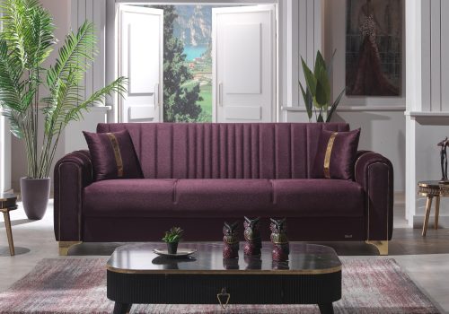 Le canapé lit en velours violet tendance idéal de jour comme nuit.