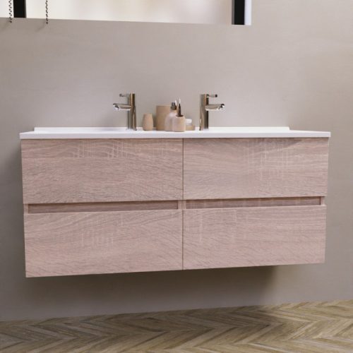 Un meuble de salle de bain au style moderne et épuré avec tiroirs de rangement.