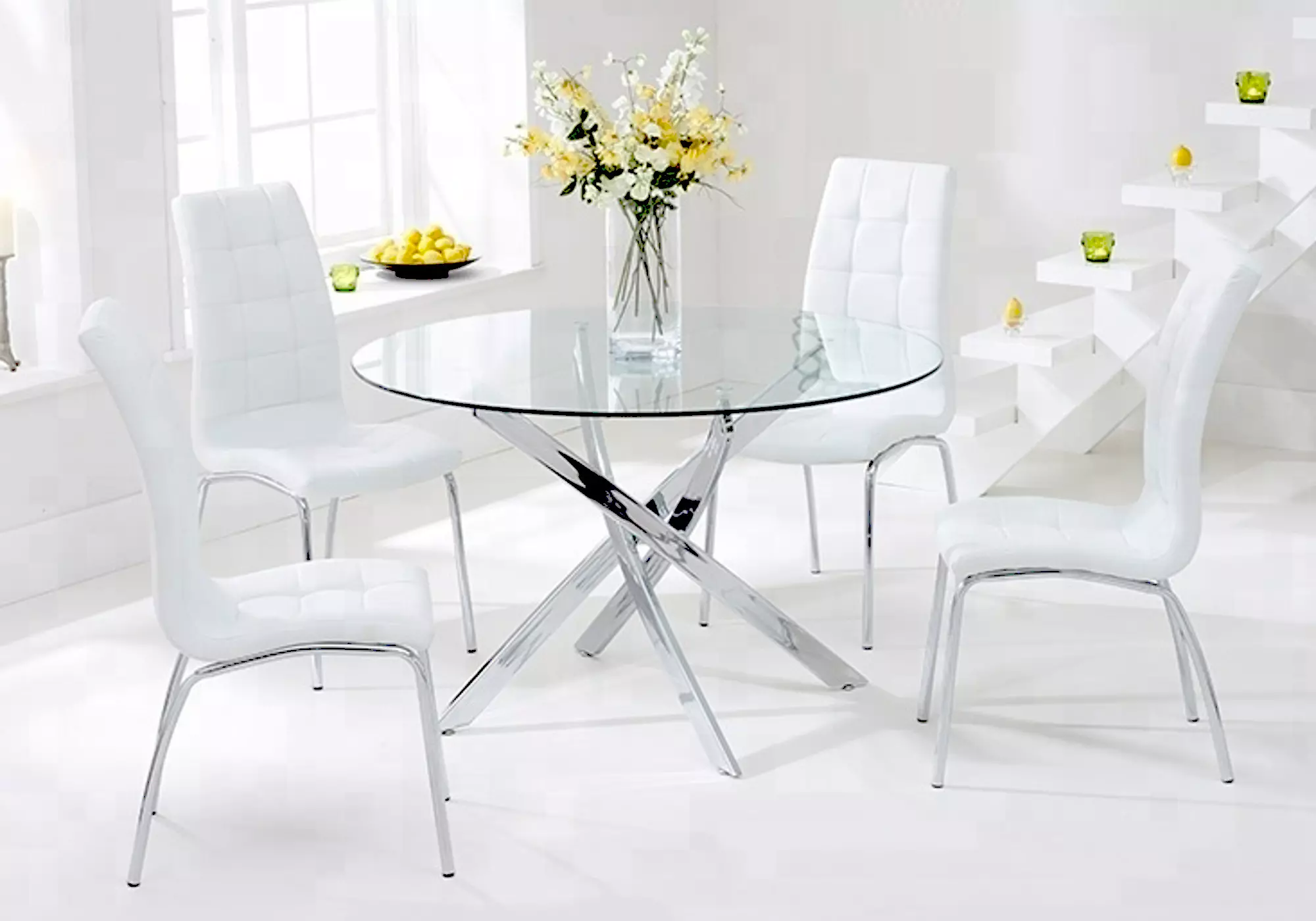 Ensemble table ronde + 6 chaises capitonnées blanches design pour votre salle à manger ou cuisine.